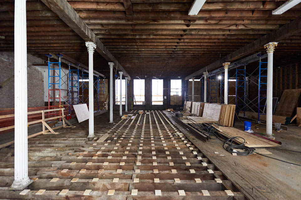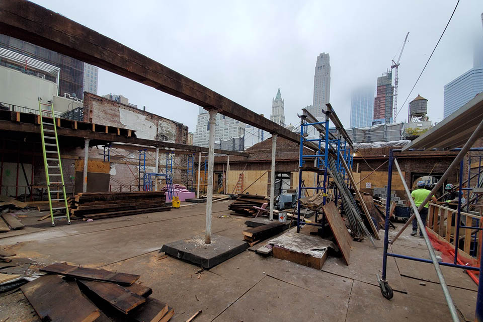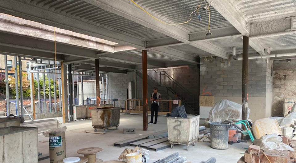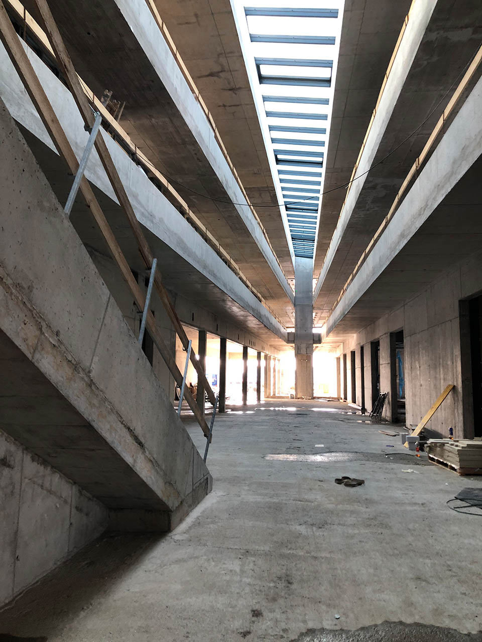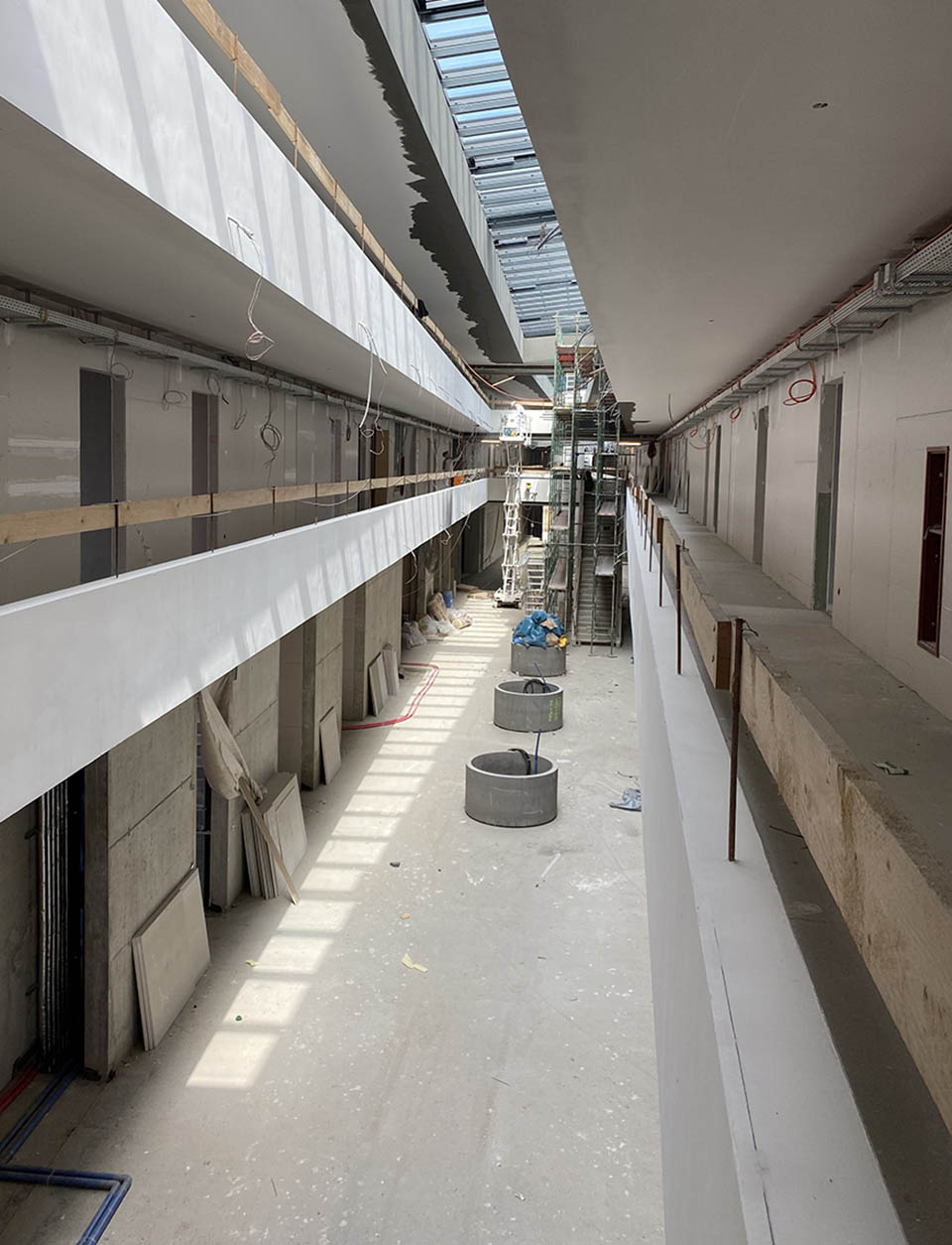 Work in Hotel Motto is in full progress. A new roof structure will help to unify the building complex and to create the connection to the existing neighbouring building. The plinth zone is also being redesigned and will integrate all the openings needed such as the hotel entrance, access to the metro line, and delivery access for the shops. A new staircase being built on the courtyard side will connect the staggered floor levels of the two wings and will lead to the roof terrace.