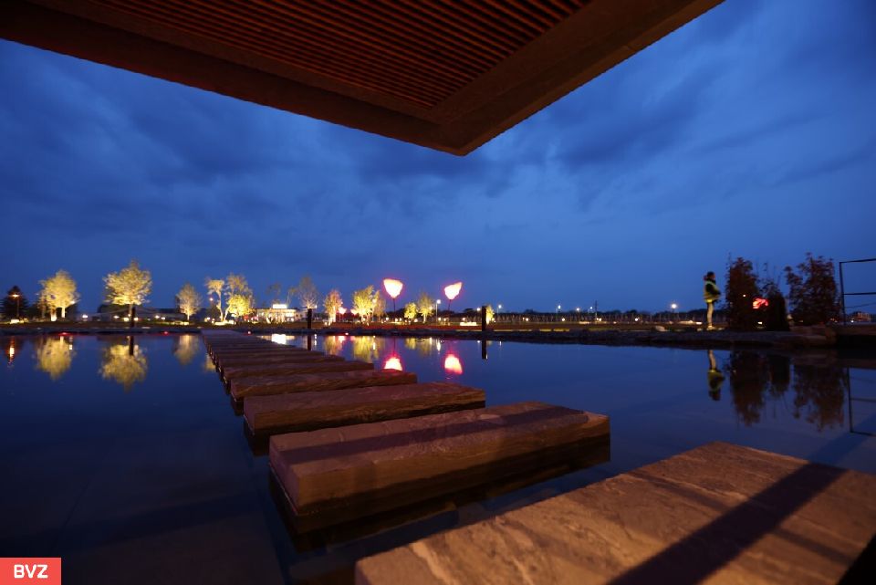 Windows, slits, and incisions in the building volume allow the interior and exterior to be experienced from everywhere and provide natural light and ventilation. To the southwest, the village square merges with a terrace with a natural pond in front of it. In the wellness and spa area there are large separate pools for children and adults.